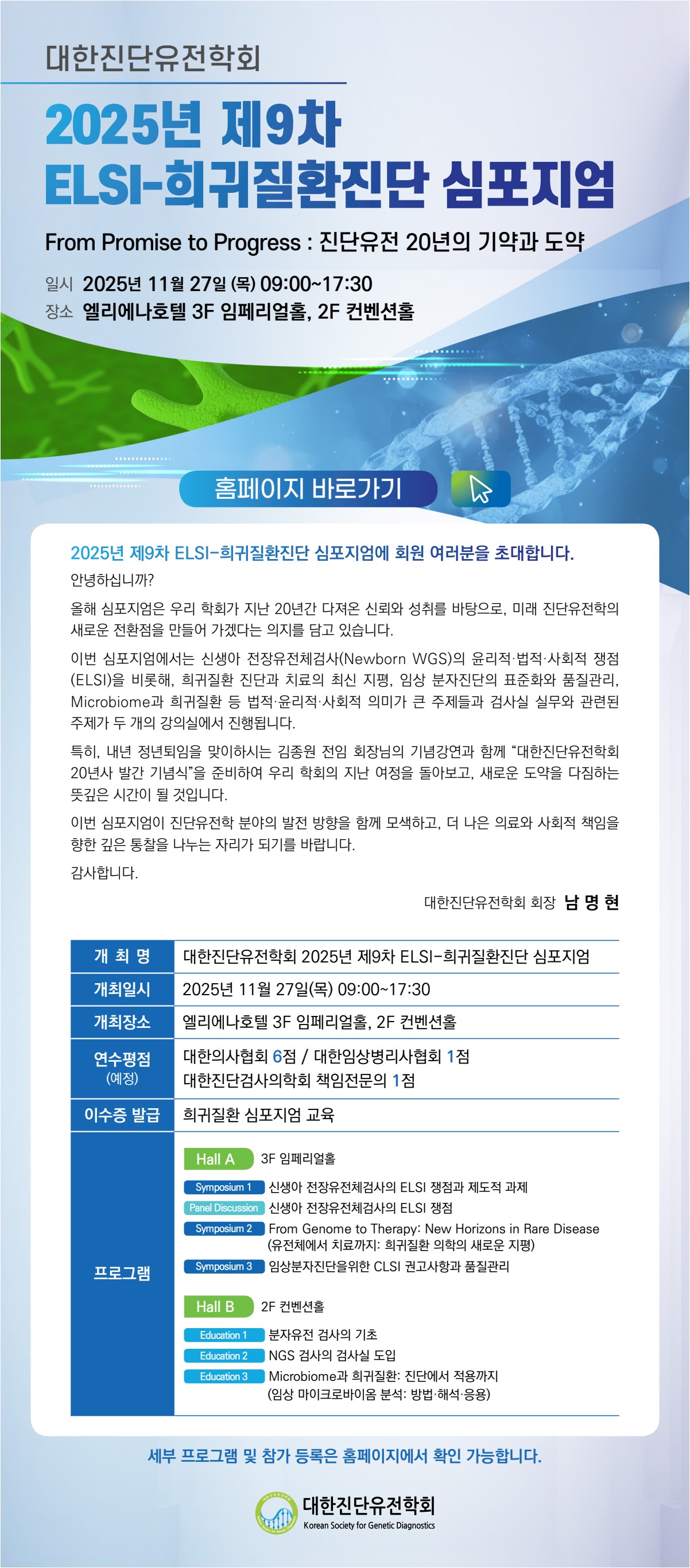 [대한진단유전학회] 2025년 제9차 ELSI-희귀질환진단 심포지엄 안내